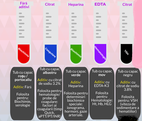 - Vacutainere cu capac albastru, cu citrat de sodiu 3.2% și proporție sânge/anticoagulant de 9:1(volum 5 mL);