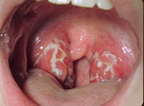 - Angina eritemato-pultacee(alba)-are ca etiologie streptococul beta hemolitic cel mai frecvent dar poate să fie produsă și de (stafilococ, pneumococ, Friedlander și se manifestă asemănător cu precedenta dar cu simptomatologie mai accentuată (febră, odinofagie intensă, adenopatii subangulo-mandibulare, cu amigdalite mărite de volum, congestionate, acoperite de un exudat alb, cremos care inițial este punctiform, apoi confluează și formează membrane.