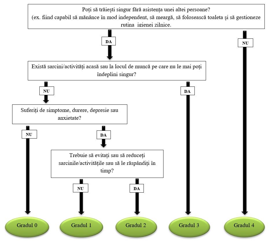 4 | Limitări funcționale severe | Nevoie de asistență în activitățile zilnice datorită simptomelor, durerii, depresiei sau anxietății: este necesară îngrijire medicală |